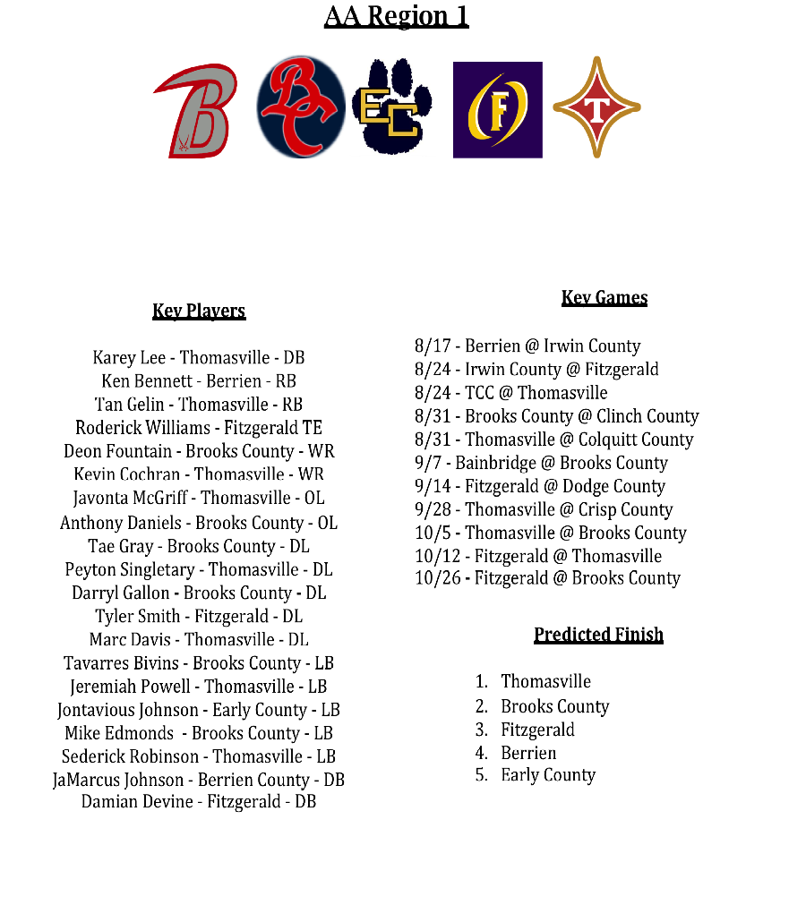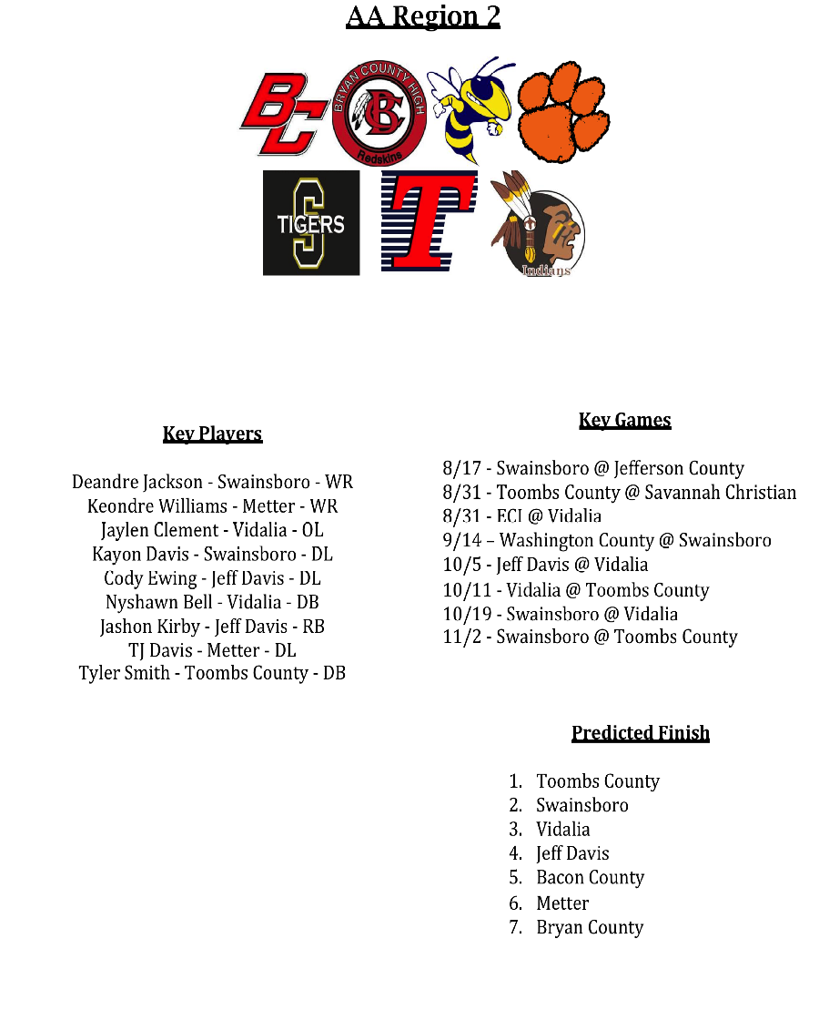 We don’t expect for anyone to be upset that Benedictine has moved on to Class 3A. We believe the region will be more up for grabs this season, but we give the nod to Toombs County. Swainsboro, Vidalia and Jeff Davis should be in the mix all season long.