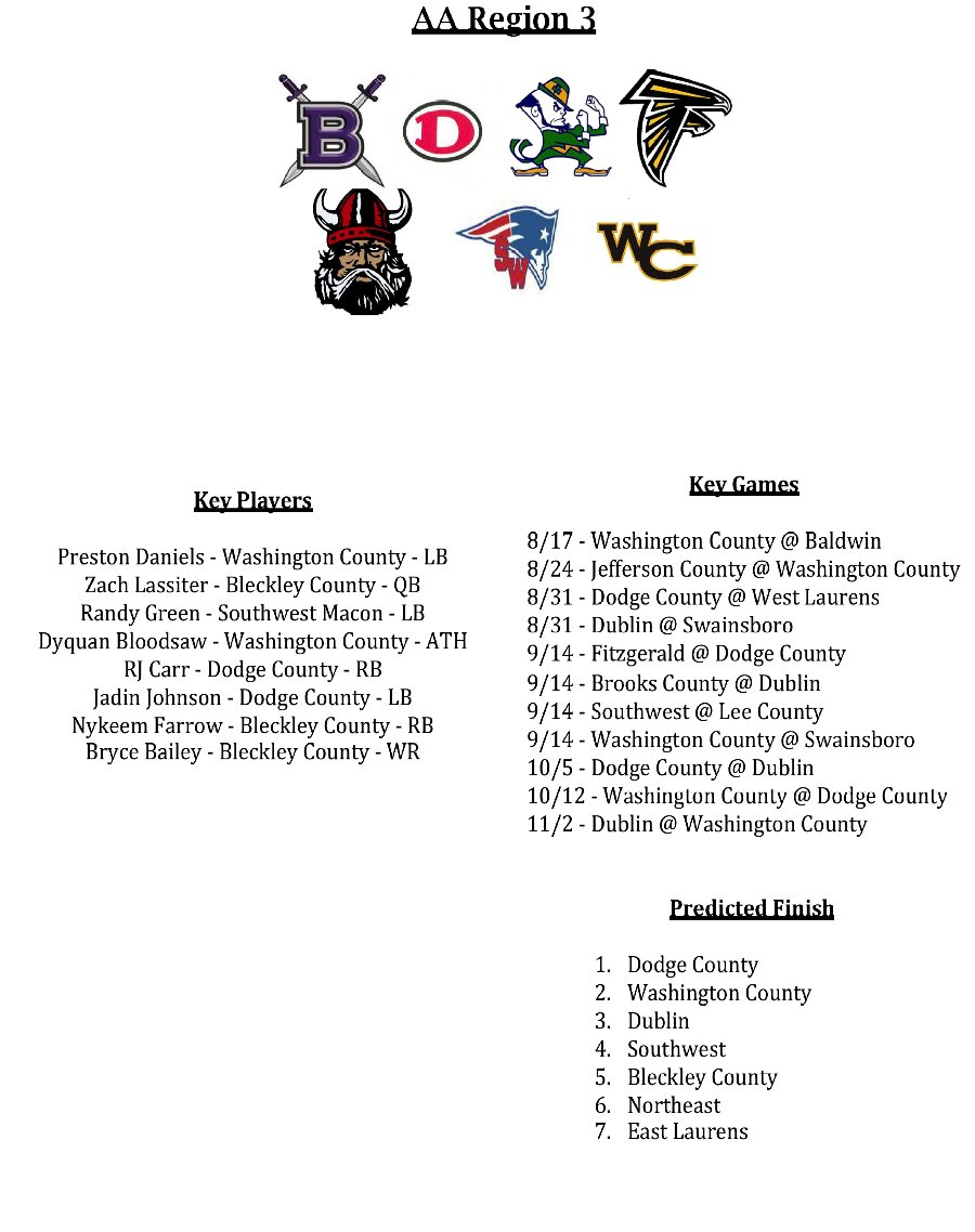 Dodge County is our pick to win region 3. We expect for Washington County and Dublin should battle it out for the number two seed in the region.