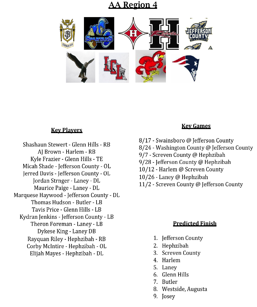 We expect a little bit of a drop off from defending region champ, Screven County. With the addition of Hephzibah coming down from class 4A, this region just got a little tougher. We are buying in to the Hephzibah hype, but Jefferson County should be the class of the region in 2018.