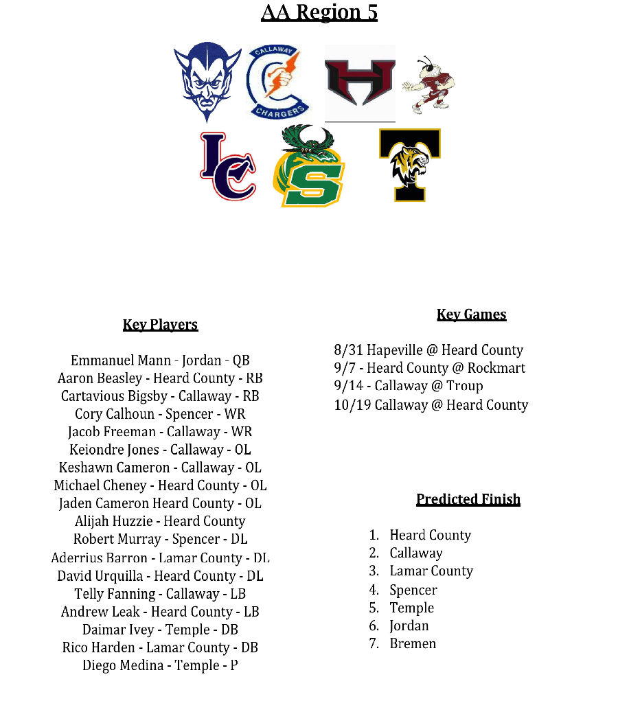 We have region 5 as a two-horse race, between Heard County and Callaway. The two teams will face off on October 19th, and we believe this game will decide the region champion. Heard County gets the nod for as region champ.