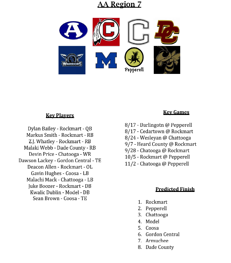Rockmart is our pick here for to repeat as region champ. The Yellow Jackets return several weapons for an offense that averaged over 40 points per game last season. Pepperell, Chattooga, Model and Coosa should be in the mix for playoff spots. Gordon Central should be much improved and are our dark horse to qualify for a playoff spot.