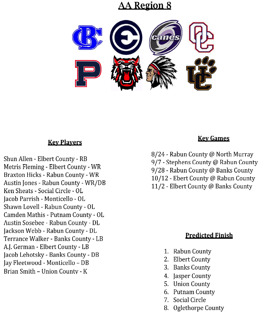 Rabun County is our pick for to win the region again this year. Elbert County could be a team that challenges Rabun County, but we just think the Wildcats return to much for the Blue Devils, or anyone else to unseat them.