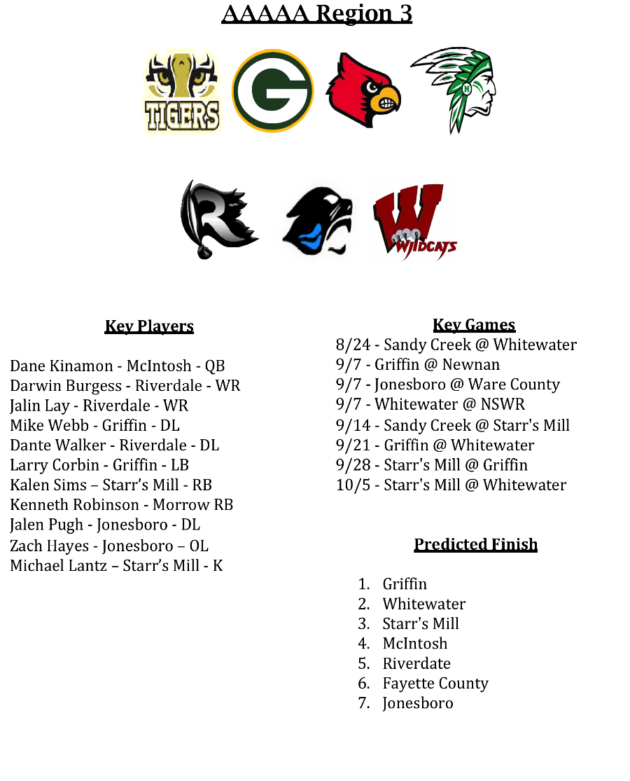 We like Griffin to lay claim to the region title this season, but it won’t be a run away. Starr’s Mill has to replace a lot of talent from a season ago. We think Whitewater could be a team that challenges the Bears. Our sleeper team is McIntosh. They’ve got a pretty good signal caller under center. While McIntosh won’t surprise folks in Peachtree City, they could be a surprise team for the rest of the state.