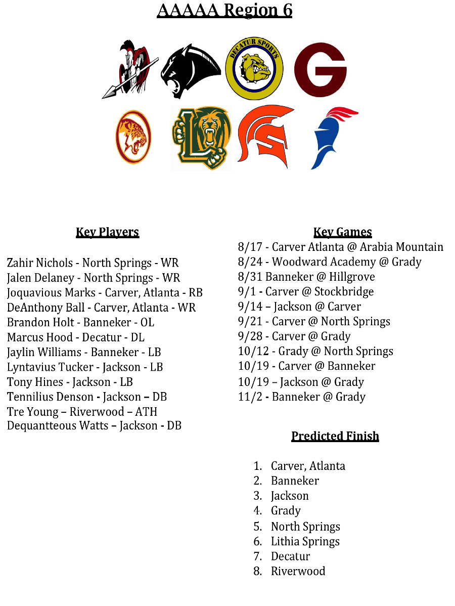 The Carver Panthers are our pick to top Region 6 this season. They return perhaps the best running back in the region and we believe that will be just enough to edge out Banneker and Jackson.