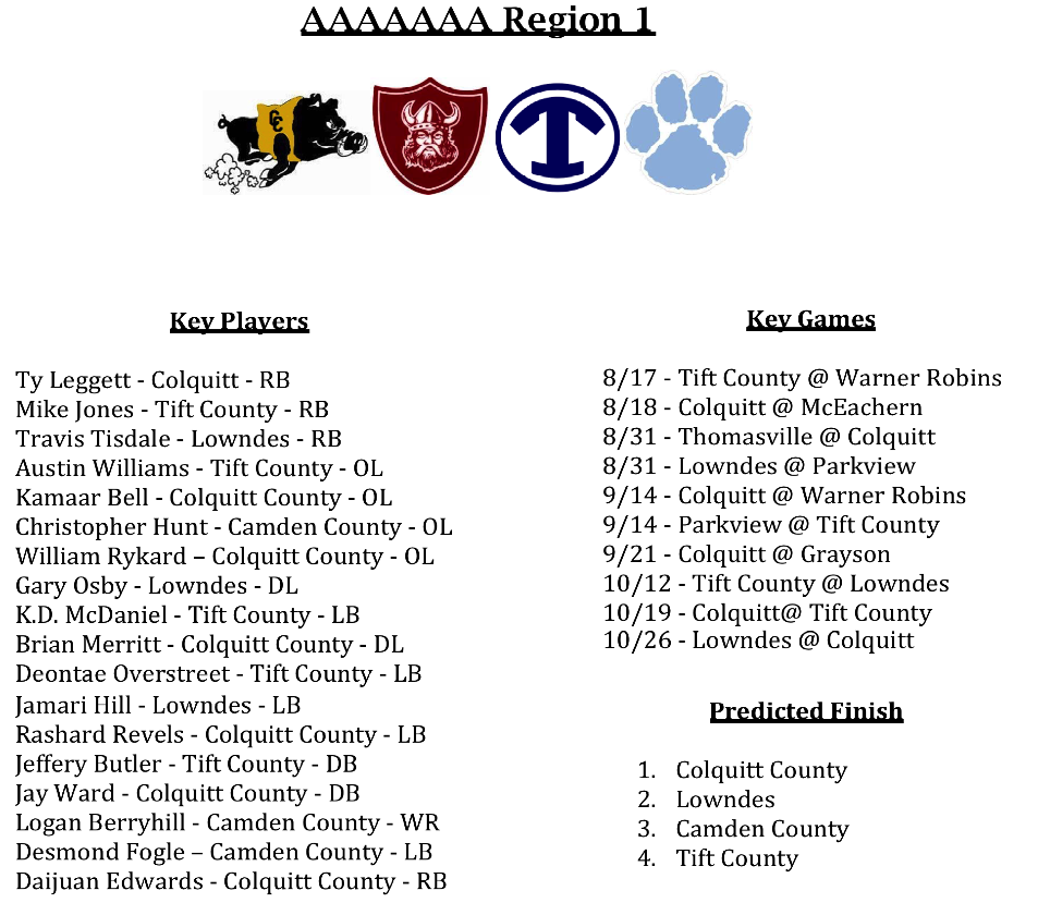 Colquitt County appears to be the usual suspect here to win the region. While the Packers finished third in the region last season, they return plenty of talent on both sides of the ball to make another deep run into the state tournament. Our surprise, which might not be a surprise, will be Camden County. We think the Wildcats will improve enough to return to the playoffs in 2018.