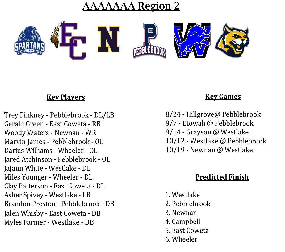The Pebblebrook Falcons are in the midst of a resurgence. But we believe this is still Westlake’s region for the taking. We know we aren’t going out on a limb with the top four teams here, but these look like a safe bet. It’s up to East Coweta and Wheeler to prove us wrong.