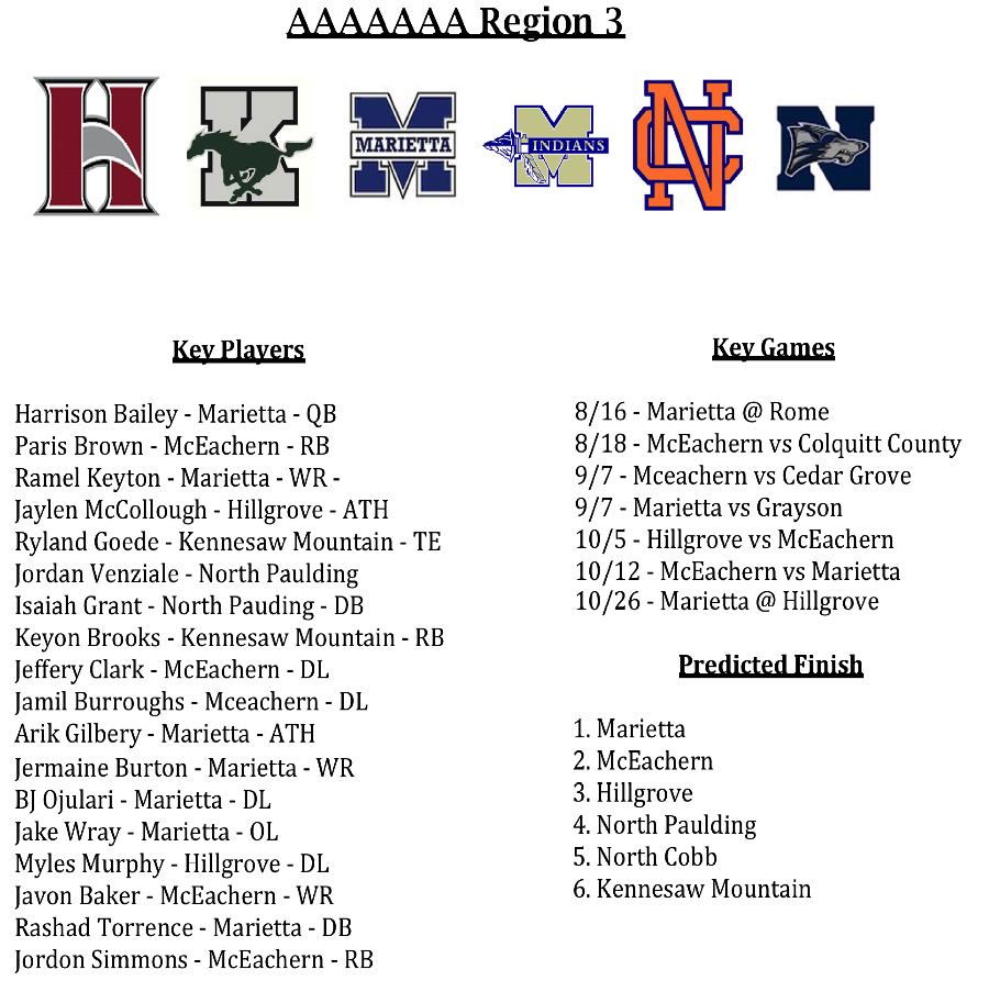 On paper, there really isn’t much reason to doubt that Marietta is the best team in the Region. Hillgrove and McEachern should have enough talent to make things interesting. But we believe there is just too much offensive firepower for most teams in the region to keep up. But if there’s anyone that will give Marietta a test, we believe it will be the McEachern Indians, who have a talented but raw sophomore at quarterback who’s looking to step in to the limelight himself.