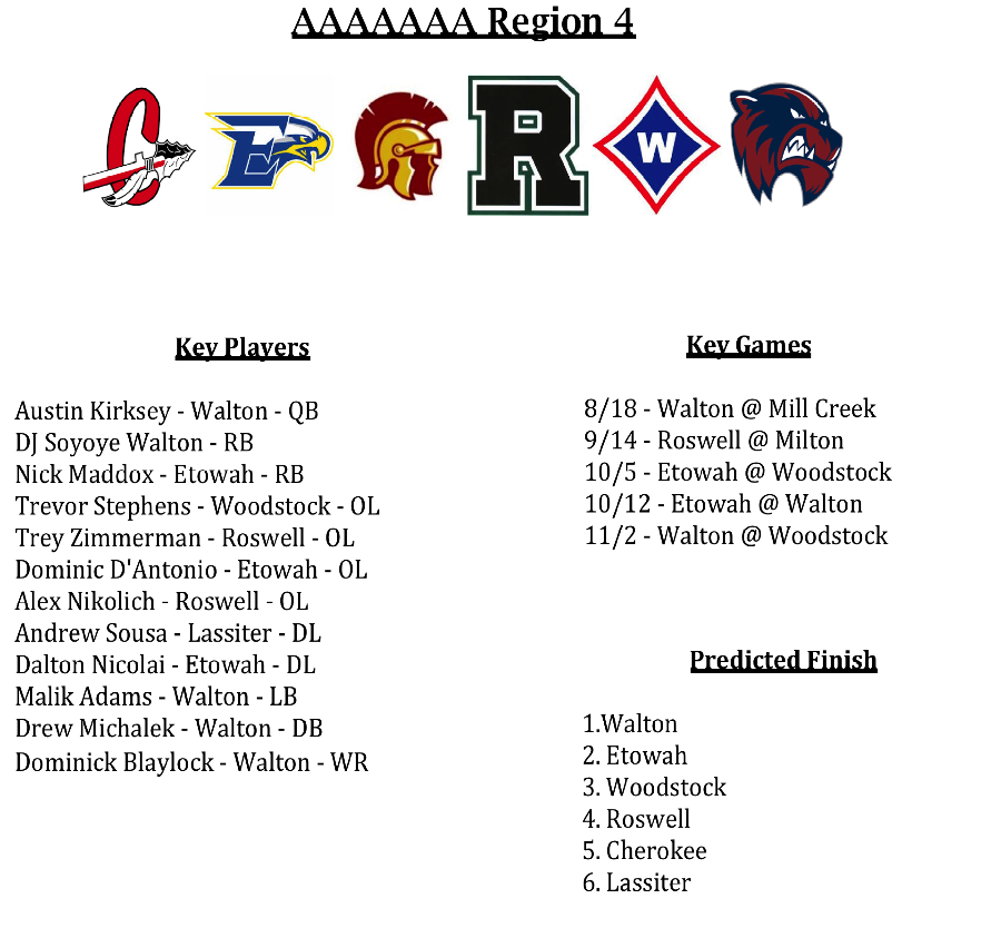This region should be Walton’s for the taking. They return a very talented quarterback and receiver tandem. Probably too much for any region opponent to keep in check. The real battle will be for the last three playoff spots. We like Etowah, because they return an experienced back and a pretty good offensive line. We expect Woodstock and Roswell to be somewhere in the mix come late-October.
