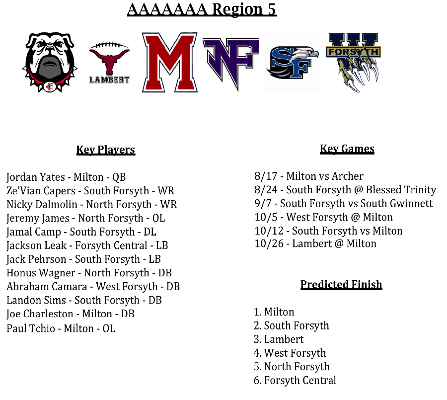 We believe that this will be a two-horse race ultimately between Milton and South Forsyth. The South Forsyth Eagles do get hit a little bit with the opening of Denmark High, but we think they’ll play well enough to be in contention for a region title. The October 12th matchup with Milton should go a long way in determining the region champion.
