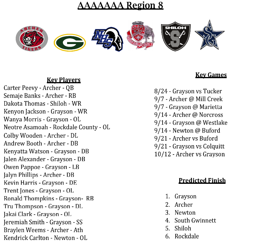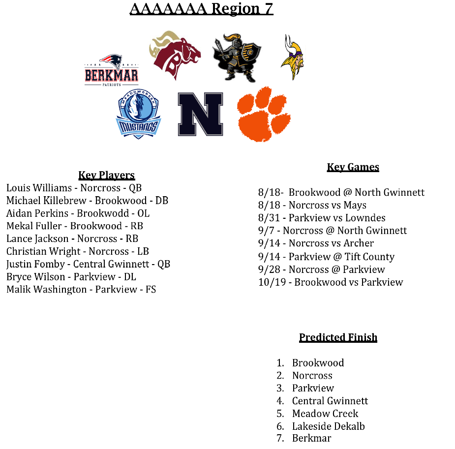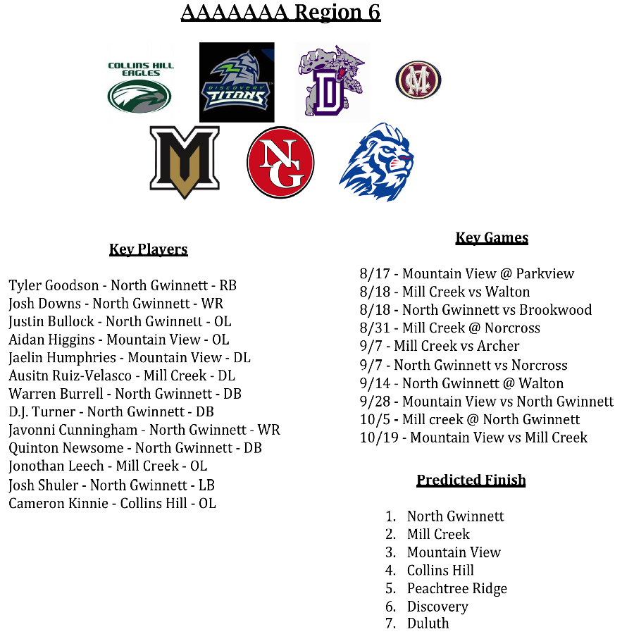 North Gwinnett is the defending 7A state champion. This region is no cake-walk, but we think that North Gwinnett will bring home another Region Title. We expect for Mill Creek and Mountain View to contend for the 2nd spot in the region. Peachtree Ridge and Discovery should be improved, but not enough to make the top four this season.