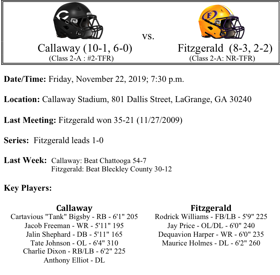 The Fitzgerald Purple Hurricanes come calling after their victory over Bleckley County. The Hurricanes are in the second round of the playoffs for the 17th time in 18 seasons. Fitzgerald is 1-3 when they are held to 24 points or less this season. They have defeated four playoff teams this season. We like Callaway this week by two touchdowns