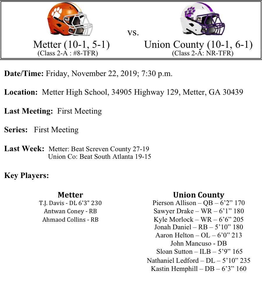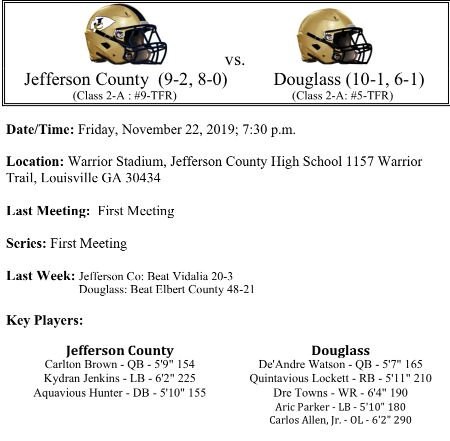 We move on to the second round of the 2A GHSA Football Playoffs. Last week, all of the #1 seeds advanced to the second round. Region 1 and Region 2 advanced 3 teams each to play this Friday. This preview features matchups between Jefferson County-Douglass, Callaway-Fitzgerald, Metter-Union County and Rockmart-Brooks County. Please let us know if there are any errors. As always, thanks for reading. Best of luck to all the teams competing this weekend!