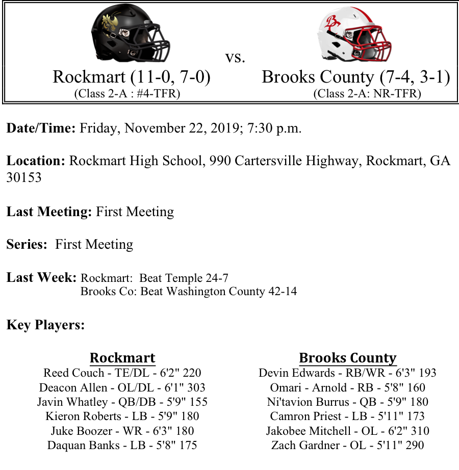 The Brooks County Trojans ran past Washington County last week to advance to the second round for the 12th consecutive season. The Trojans have now defeated four playoff teams on the year. We like the Trojans to keep this game competitive and expect them to be the toughest opponent Rockmart has faced to date. But we like the Yellow Jackets by a touchdown at home this week.