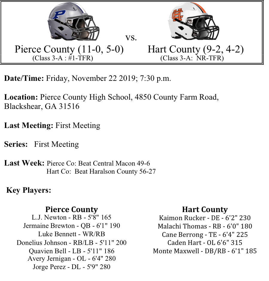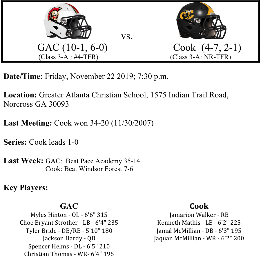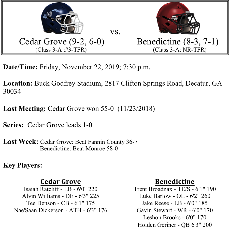 We move on to the second round of the 3A GHSA Football Playoffs. Last week, all of the #1 seeds advanced to the second round. Region 7 advanced 3 teams into the second round. This preview features matchups between Cedar Grove-Benedictine, GAC-Cook, Pierce County-Hart County and Peach County-Calhoun. Please let us know if there are any errors. As always, thanks for reading. Best of luck to all the teams competing this weekend!