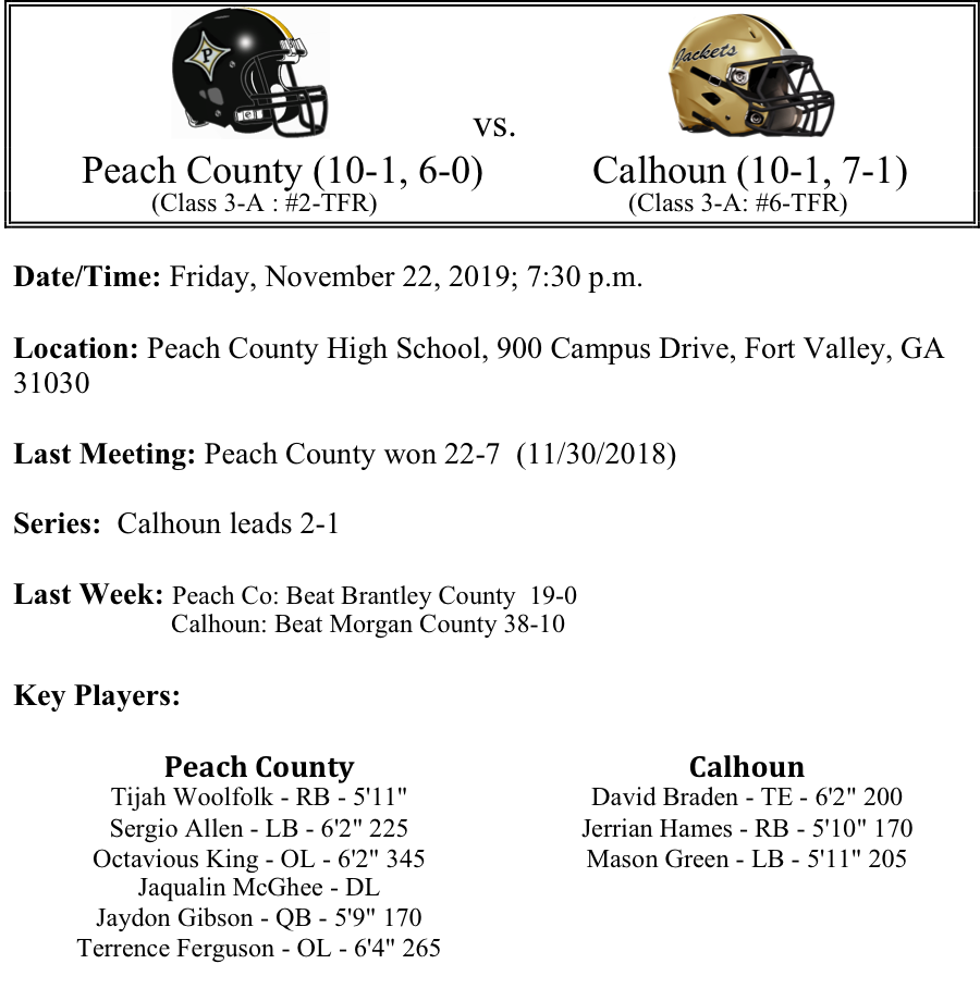 The Calhoun Yellow Jackets advanced to the second round for the 19th consecutive season. Calhoun has now won seven straight games. The Yellow Jackets have not given up more than 14 points in a game during this win streak. Calhoun has now defeated five playoff teams this season. This game is a rematch of a 2018 semifinal game. Calhoun probably has revenge on the mind, but we like Peach to prevail. Trojans by 7.