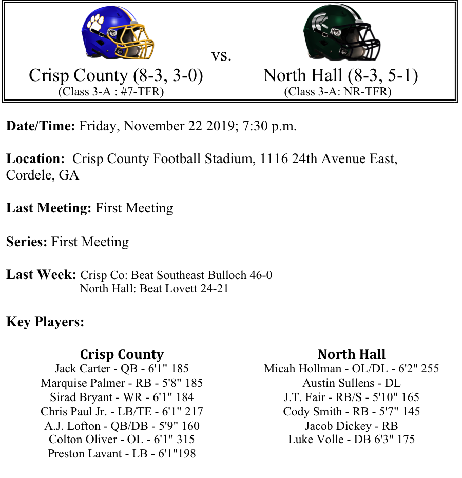 The Crisp County Cougars have advanced to the second round of the playoffs for the third time in four years. The Cougars have now won their last five games and have only allowed opposing teams 27 points during that stretch. Crisp has now shut out two opponents on the year. The Cougars three losses have come to teams in Class 4A and 5A by a combined 10 points. They have defeated five playoff teams this season.