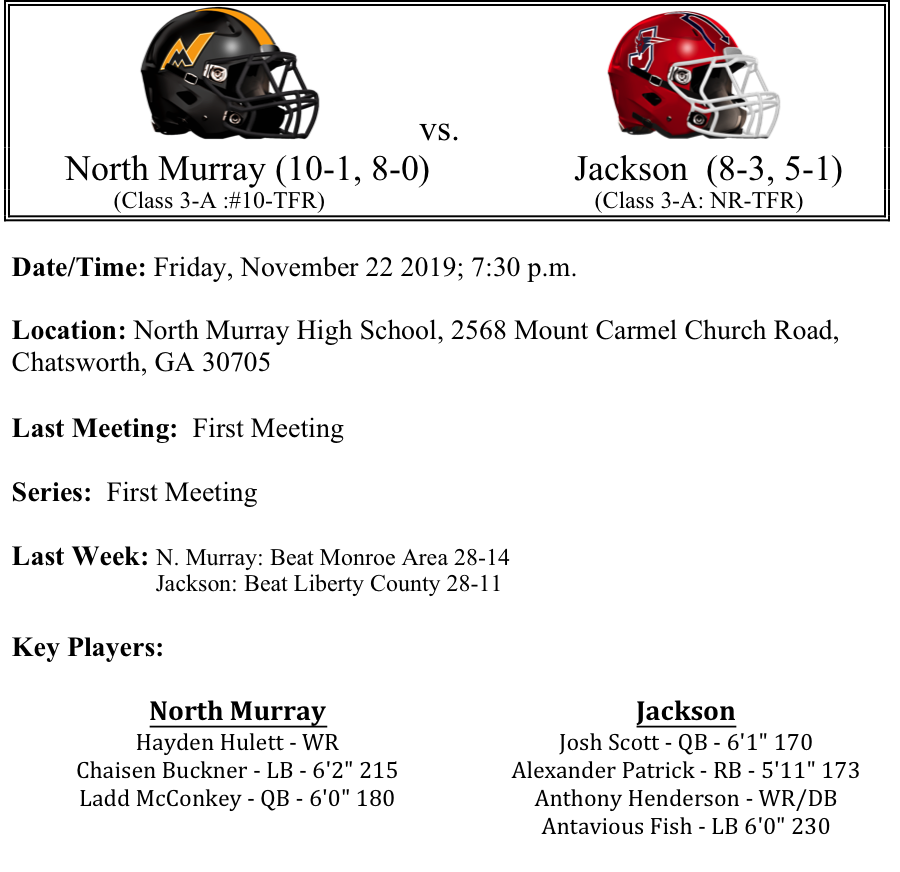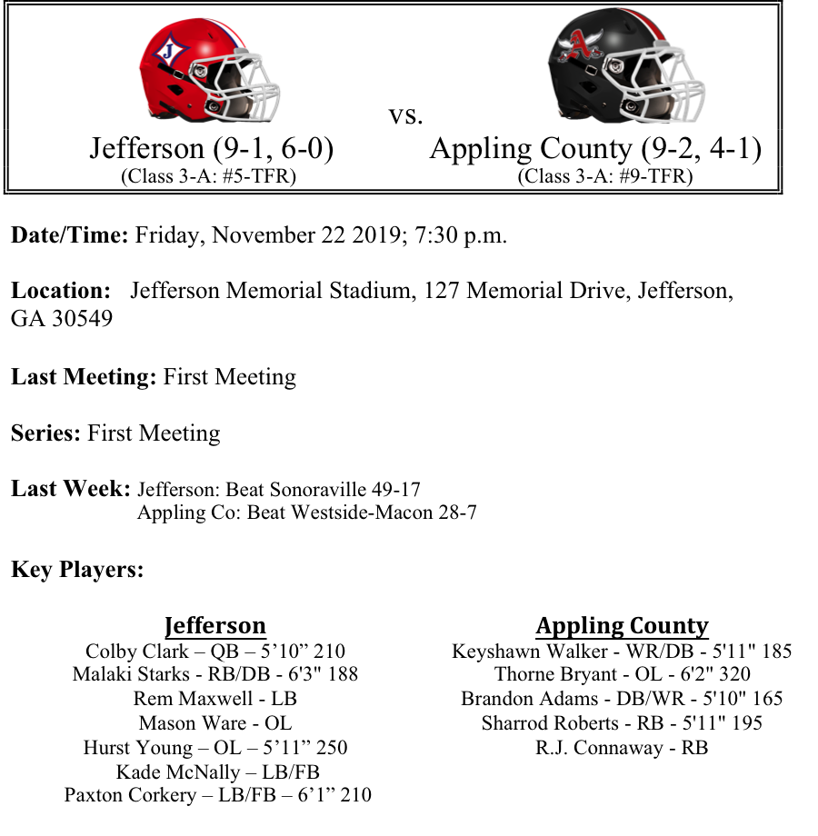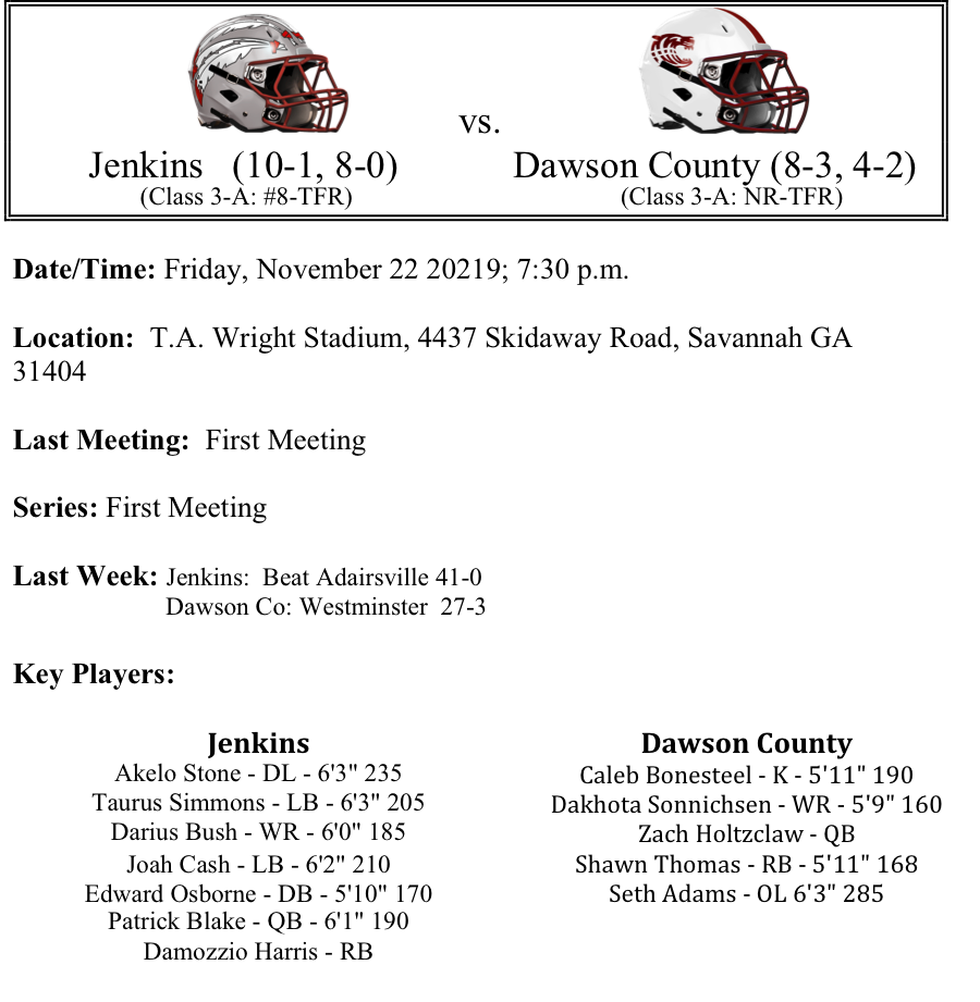 We move on to the second round of the 3A GHSA Football Playoffs. Last week, all of the #1 seeds advanced to the second round. Region 7 advanced 3 teams into the second round. This preview features matchups between Jenkins-Dawson County, North Murray-Jackson, Crisp County-North Hall and Jefferson-Appling County. Please let us know if there are any errors. As always, thanks for reading. Best of luck to all the teams competing this weekend!