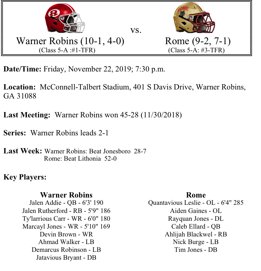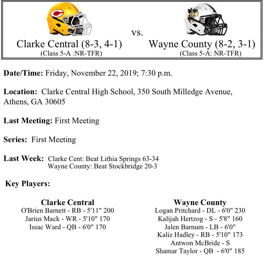We move on to the second round of the 5A GHSA Football Playoffs. Last week, the Hiram Hornets scored the biggest upset in round won as they beat #1 seed Southwest DeKalb. Region 7 advanced 4 teams into the second round. This preview features matchups between Clarke Central-Wayne County, Starr’s Mill-Kell, Riverwood-Dutchtown and Warner Robins-Rome. Please let us know if there are any errors. As always, thanks for reading. Best of luck to all the teams competing this weekend!