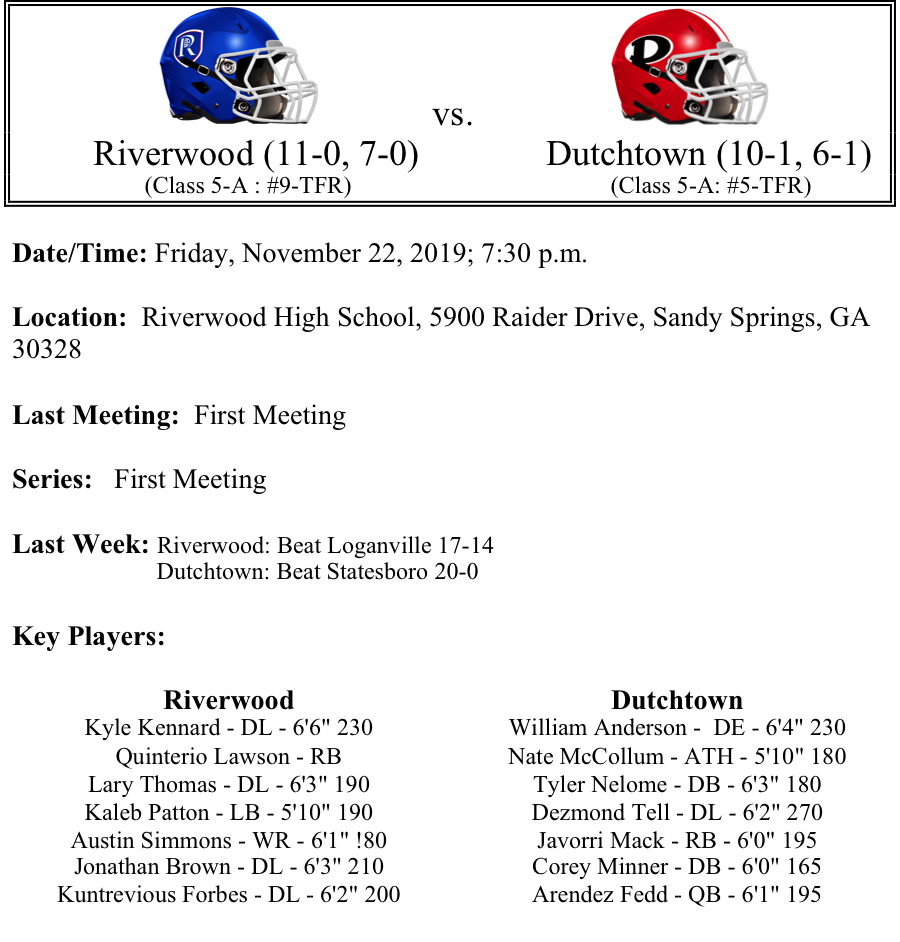 The Riverwood Raiders stayed undefeated by edging Loganville last week. The victory was by the slimmest of margins all season for the Raiders. The Raiders advanced to the second round for the first time since 2001 and for only the second time in school history. The Riverwood defense has not surrendered more than 20 points in a game this season.