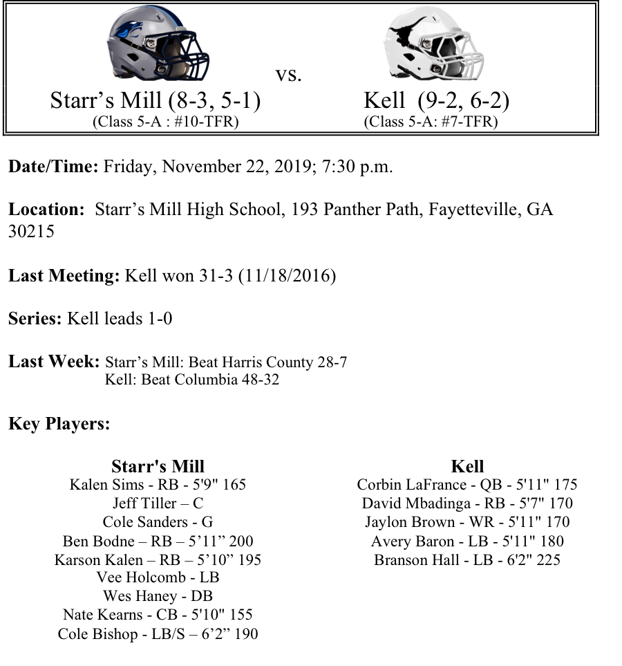 The Kell Longhorns are in the second round of the playoffs for the second consecutive year and for the ninth time in ten years. Kell has now won four straight games. However, the 32 points they surrendered to Columbia was the most since they lost to Carrollton back on October 18th. Kell has defeated three playoff teams this season. We like Starr’s Mill to take control of the game on the ground this week and outlast Kell in a close game. Starr’s Mill by 1.