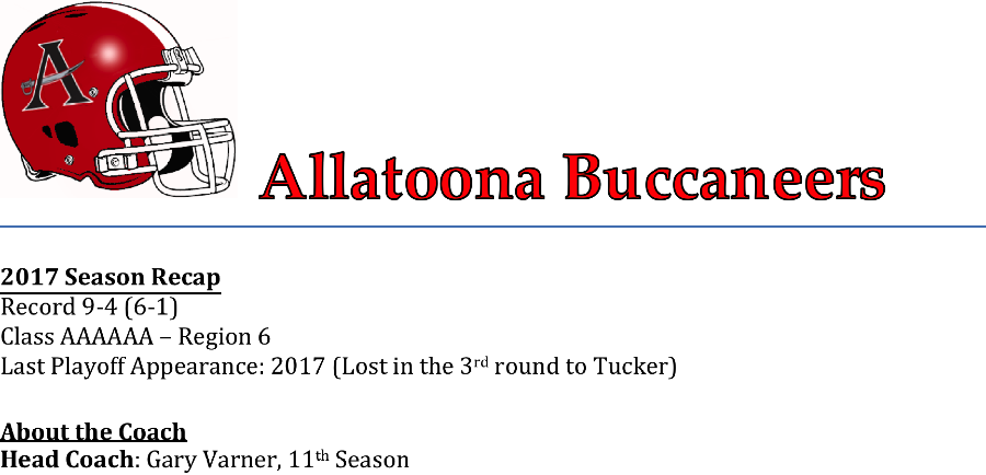 Gary Varner begins his 11th season at Allatoona. Coach Varner has had the Bucaneers (Bucs) playing at a high level for all eleven seasons. Since starting region play in 2010, the Bucs have never missed the playoffs. They won a state title in 2015 and last season advanced to the 3rd round of the state playoffs. In spite of all of that success, Coach Varner told us about one of the biggest challenges his team will face in 2018.