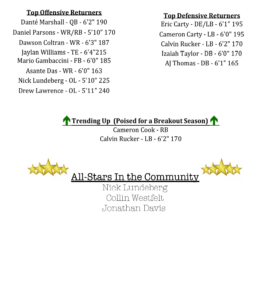 Danté Marshall returns at quarterback for the Bucs. As a sophomore in 2017, Marshall passed for 1,260 yards and 11 TDs. Joining Marshall in the backfield will be Daniel Parsons, as he looks to take over most of the carries. Parsons was tied for the eam lead in rushing touchdowns last season.
