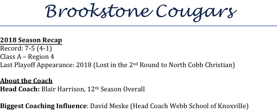 Coach Blair Harrison enters his 12th season overall as the head coach of the Brookstone Cougars. Harrison led the Cougars from 2003-2010 and then rejoined the team as head coach in 2017. During his tenure, the Cougars have only missed the playoffs once. We asked Coach Harrison what his biggest challenge was coming into the 2019 season.