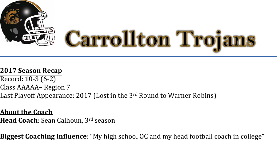 Sean Calhoun begins his third season as head coach of the Carrollton Trojans. The Trojans are another program in the state that is steeped in rich football tradition. The Trojans are 7-time state champs. Coach Calhoun has taken the Trojans to the 3rd round of the playoffs in each of his first two seasons. We asked Coach Calhoun what his biggest challenge was for the 2018 season.