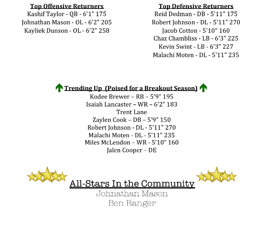 The defensive line returns Malachi Moten and Robert Johnson. While Reid Dedman and Jacob Cotton return in the secondary.