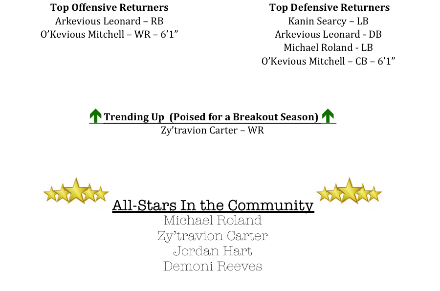 The Hawks will lean on the legs of running back Arkevios Leonard to help steady the offense. Meanwhile, O’Kevious Mitchell and Zytravion Carter should be players to watch for the Hawks at wide receiver.