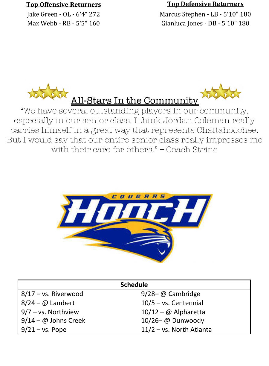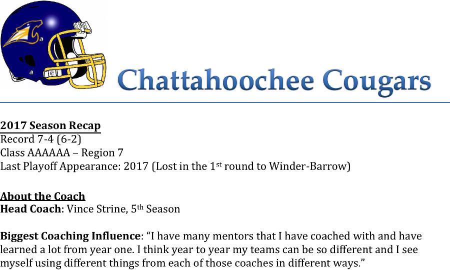 Coach Vince Strine guided the Chattahoochee Cougars back to the playoffs for the first time in six seasons. The Cougars finished third in the region behind Alpharetta and Centennial. The Cougars should be back in the mix with the return of some key players. However, Coach Strine addressed one of the biggest challenges he and his staff face going into the season.