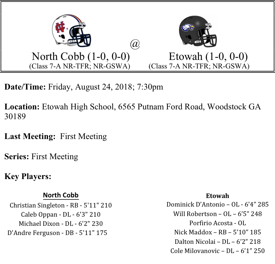 Both North Cobb and Etowah got their season’s started off with a victory last week. North Cobb was led by Christian Singleton, who rushed for 174 yards on 30 carries. Singleton was truly a work horse. We can only imagine that the Etowah defense will be getting a steady dose of him all night. The Eagles do return a couple of talented defensive linemen that should make repeating last week’s performance by Singleton a little more challenging.