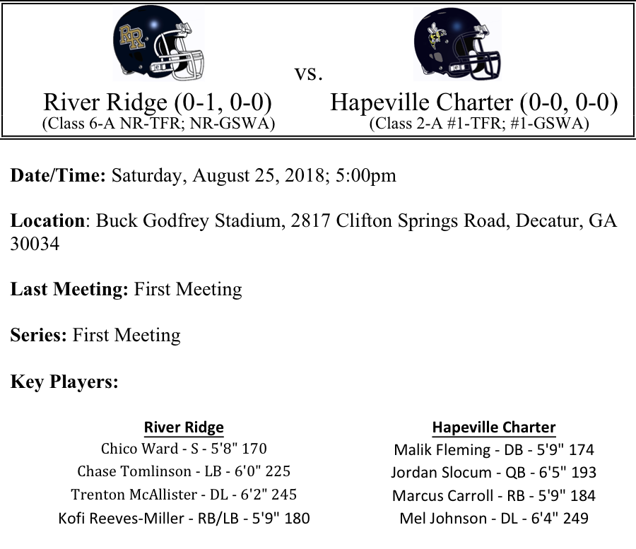 The River Ridge Knights dominated time of possession last week against county foe Etowah, but were unable to convert the ball control offense into points. The Knights attempted 38 running plays from scrimmage. We can probably expect more of the ground game from the Knights as the again face one Georgia’s football titans over the last few years, the Hapeville Hornets. Pay no attention that the Hornets are a Class AA team. They won the state title last year, and anyone who has spent any time in the state of Georgia knows that there is a high level of high school football played in every classification. And yes, the Hapeville Hornets are a prime example.