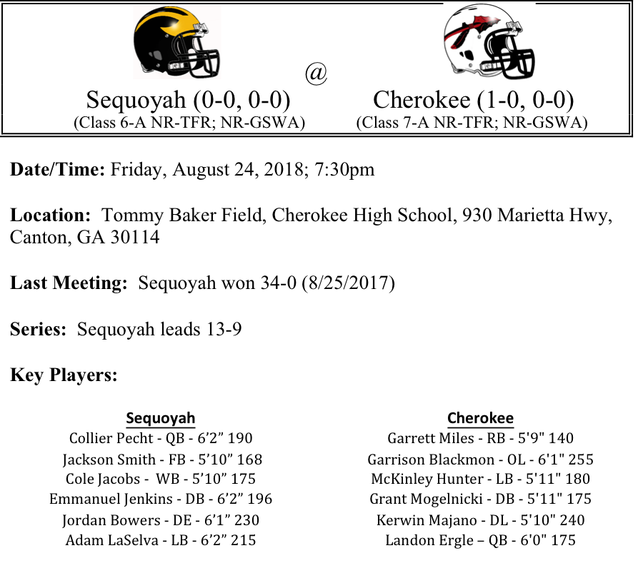 The Cherokee Warriors got 2018 off to a good start as they held off a late charge from North Forsyth last week. QB Landon Ergle used his arms and feet to help guide the Warriors to victory. This week, the test gets a little tougher as the Sequoyah Chiefs come calling. The Chiefs have plenty of talent at the skill positions and look to be one of the top teams in the county this season. Sequoyah is led by senior quarterback Collier Pecht. He runs the Chiefs Wing-T offense with great precision. In order to slow down the Chiefs, Kerwin Majano and the Warriors defensive line will need to find a way to disrupt Sequoyah’s timing. Pecht proved last season he can pick teams apart if given enough time.