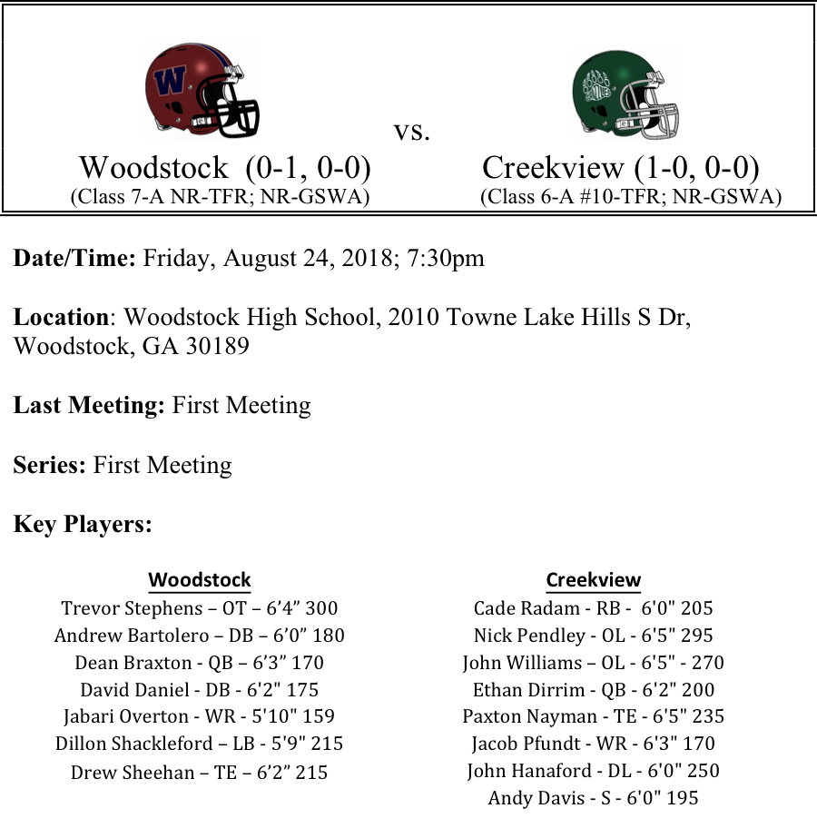 Dean Braxton held his own in his first start under center as he and the Wolverines got some much-needed game experience. Woodstock will present a little better challenge for the Grizzlies, as the two teams play in the regular season for the first time ever. However, we think Creekview might be ready to make a statement that they are one of the top teams in the county in 2018. We like the Grizzlies by a touchdown.