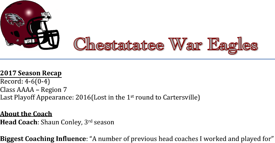 Shaun Conley begins his third season as the head coach of the Chestatee War Eagles. Last season, the War Eagles missed out on the playoffs. Their region was a grinder in 2017, as it included the two teams that played for the state title in Class 4A. As if that wasn’t challenging enough, in 2018 Flowery Branch was dropped down from 5A and Denmark in Forsyth County came online and will be playing in the region this season.