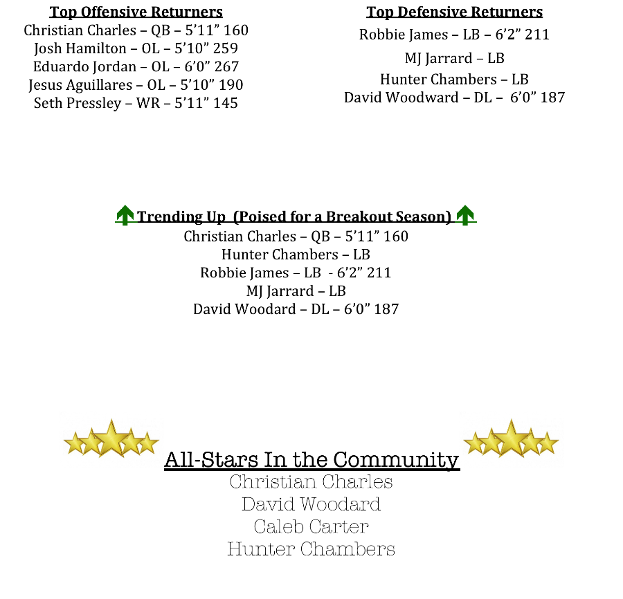On offense Christian Charles will return at quarterback. Last season, Charles split time with Storm Yarbrough, but Charles will take the reins, as Yarbrough has graduated. Charles threw for almost 500 yards and 3 TDs last season, while rushing for almost 400 yards. For his efforts, Charles was tabbed as an All-Region Honorable Mention selection.