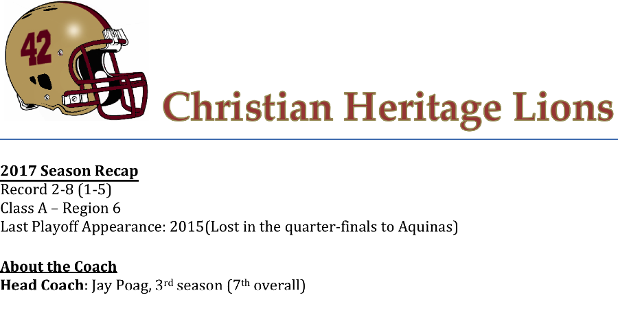 Coach Jay Poag begins his third season as head coach of the Christian Heritage Lions. The Lions are in their seventh season of play at the GHSA level. The Lions will face a challenging slate of games in 2018 including a 3 game stretch of regional foes Mt. Zion, Carroll, Darlington, and Trion. All of whom made the playoffs last season.