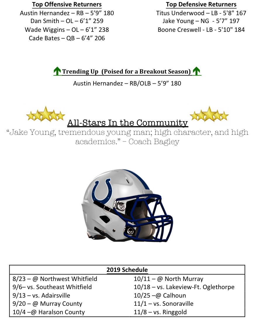 The Colts also return their top two backs, Austin Hernandez and Titus Underwood who accounted for over 800 yards on the ground last season. The Colts offensive line will be anchored by Wade Wiggins and Dan Smith.