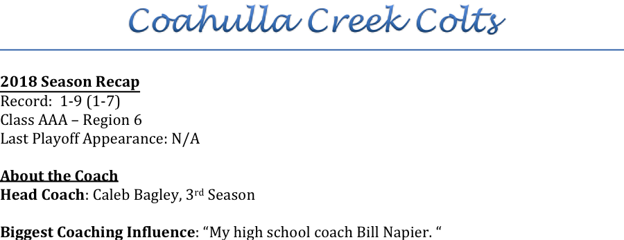 **Incase you missed it, you can check out our podcast interview with Coach Bagley here: Coahulla Creek Colts Podcast