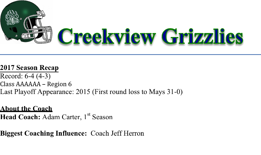 The Grizzlies defensive line will be anchored by John Hanaford and Avery Rocks. Hanaford garnered Second Team All-Region honors last season. Creekview also return their three top tacklers from a year ago, Safety Andy Davis (101 tackles), and linebackers Chance Schwartz (78 tackles) and Jacob Graham (77 tackles). Davis, a recent Citadel commit, was also a Second Team All-Region selection last season.