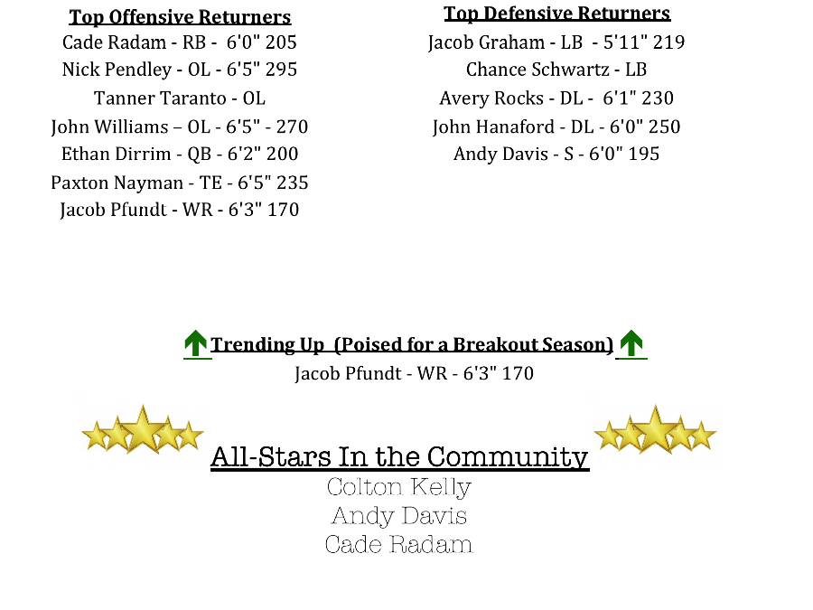 Joining Pendley to anchor the offensive line will be “Big” John Williams and Tanner Taranto. Both Williams and Pendley stand at 6’5” and both weigh in at over 270lbs. Dual sport athlete, Paxton Nayman is poised to help both in the run game and the passing game for the Grizzlies. Nayman hauled in 12 catches and had 3 receiving TDs last season. He has garnered plenty of interest from D1 coaches this past off-season.
