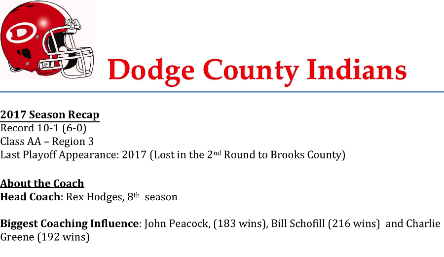 Coach Rex Hodges returns to Dodge County for his 8thseason. Last year, the Indians won their 2nd Region title under Hodges and achieved their 4thconsecutive second round appearance in the state tournament.