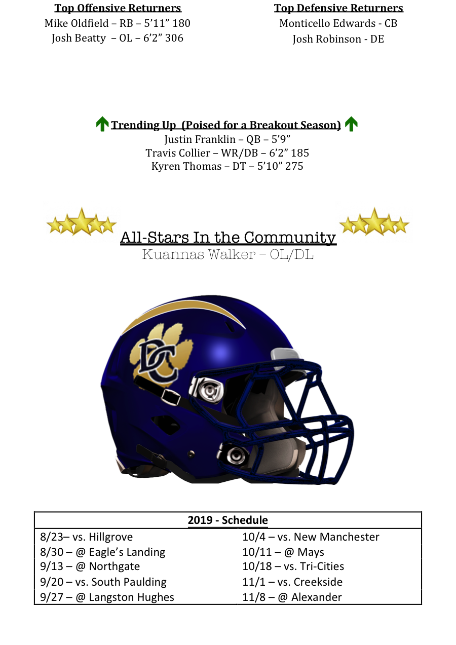 Defensively, Monticello Edwards returns in the secondary for Douglas County. Josh Robinson returns to anchor the defensive line, where they Tigers will be looking for someone to replace the production of Mataio Soli’s 22.5 sacks. Look for Robinson to get help along the line from Kyren Thomas as well. Travis Collier will also double as a defensive back which the Tigers will look to help shore up the secondary.