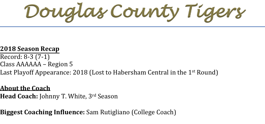 Johnny White is entering his 3rd season as head coach of the Douglas County Tigers. Coach White has taken the Tigers to the playoffs in both of the previous seasons. As Douglas County gears up for 2019, we asked Coach White what one of the biggest challenges he has for the upcoming season.
