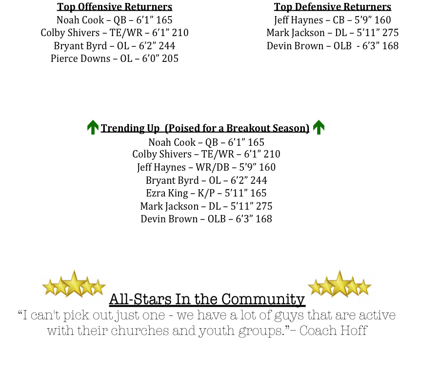 Colby Shivers is the team’s leading returning receiver, as he caught 20 balls for 363 yards and 4-TDs. Shivers was also an All-Region selection. Bryant Byrd (All-Region) and Pierce Downs will anchor the offensive line.