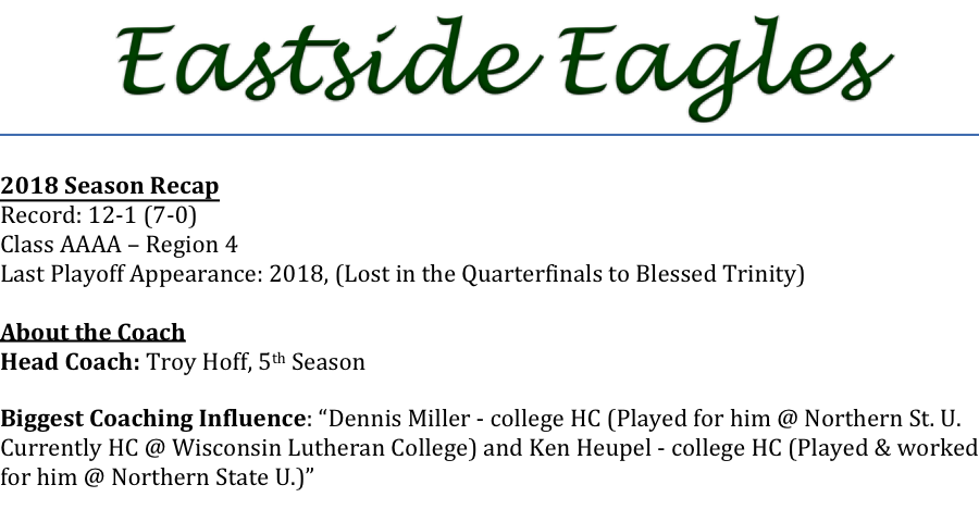 Coach Troy Hoff led the Eastside Eagles to their best season in school history in 2018. The Eagles won 12 consecutive games before being upended in the quarterfinals by eventual state champion, Blessed Trinity. While that success might be tough to duplicate, we asked Coach Hoff what his biggest challenge is in 2019.