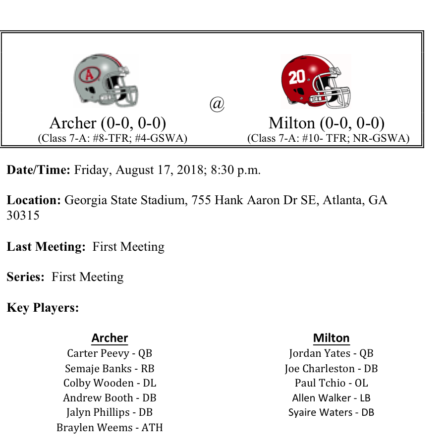 The fourth game of the Corky Kelly Classic features the Archer Tigers, who have really come on to the scene over the last several years as a force to be reckoned with in class 7A. Defensive backs Andrew Booth and Jalyn Phillips will certainly make passing the ball challenging for Milton QB Jordan Yates. Yates is a dual threat quarterback that has committed to Georgia Tech. Syaire Waters should be one of the receivers that Milton will look to help fill the void left by graduation. Archer QB Carter Peevy is no slouch himself. Last season he passed for over 2,000 yards. The Tigers have a little more experience returning at the skill positions, and that’s why we like them to win this game by two scores.