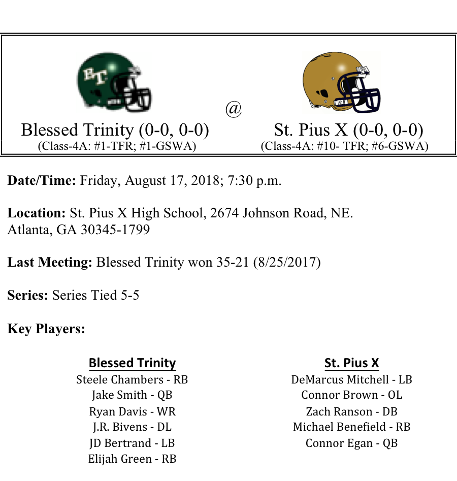 Blessed Trinity begins their title defense on the road against a very challenging opponent in the St. Pius Golden Lions. The Titans return a talented corp of starters at the skill positions on offense, including Steele Chambers and Elijah Green at running backs, Jake Smith under center and Ryan Davis at receiver. But the Golden Lions won’t be intimidated by BT. Connor Egan led St. Pius to the semi-finals last season. Michael Benefield is a talented back that will help take some pressure off of Egan. We think this game will be close for the first half. But we expect Blessed Trinity to flex it’s muscle late and win by 10 on the road.