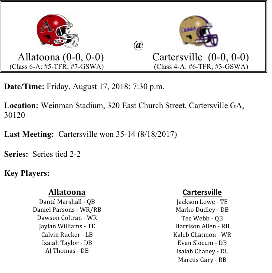 The Tee Webb era begins at Cartersville on Friday night. He will be matched up against another talented quarterback in Dante Marshall for Allatoona. Cartersville seemed to pick up where they left off, (even without Trevor Lawrence), last week in their scrimmage. But we won’t get carried away with scrimmage results. Tight-end Jackson Lowe is as good as advertised and should be poised to help lead the Purple Hurricanes air attack. We don’t think that the Bucs can win in a shootout with Cartersville. Can the Allatoona defense be physical enough to keep Cartersville in check? The Bucs offense might be their best defense this week. If they can keep Webb on the sidelines with long sustained drives, perhaps they can sway the momentum in their favor. We think this game will be closer than the 21 points last season, but we still like Cartersville by two scores.
